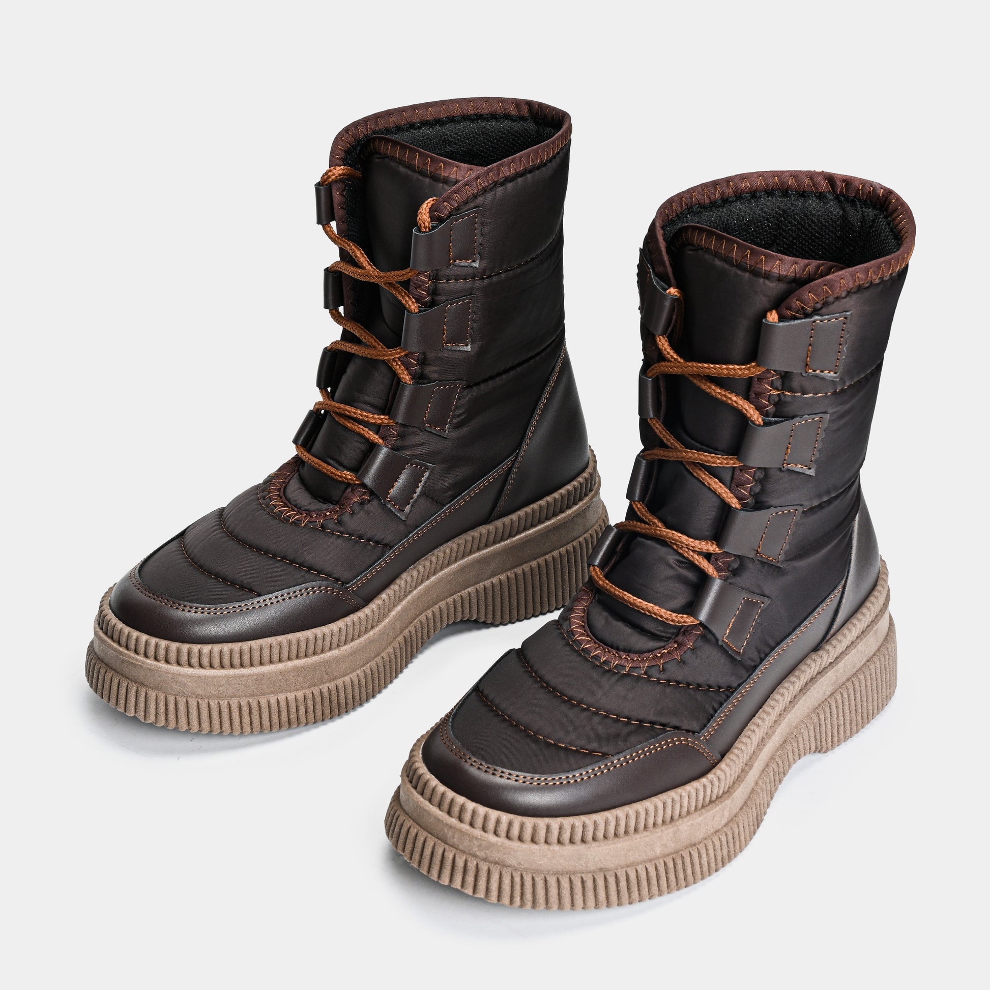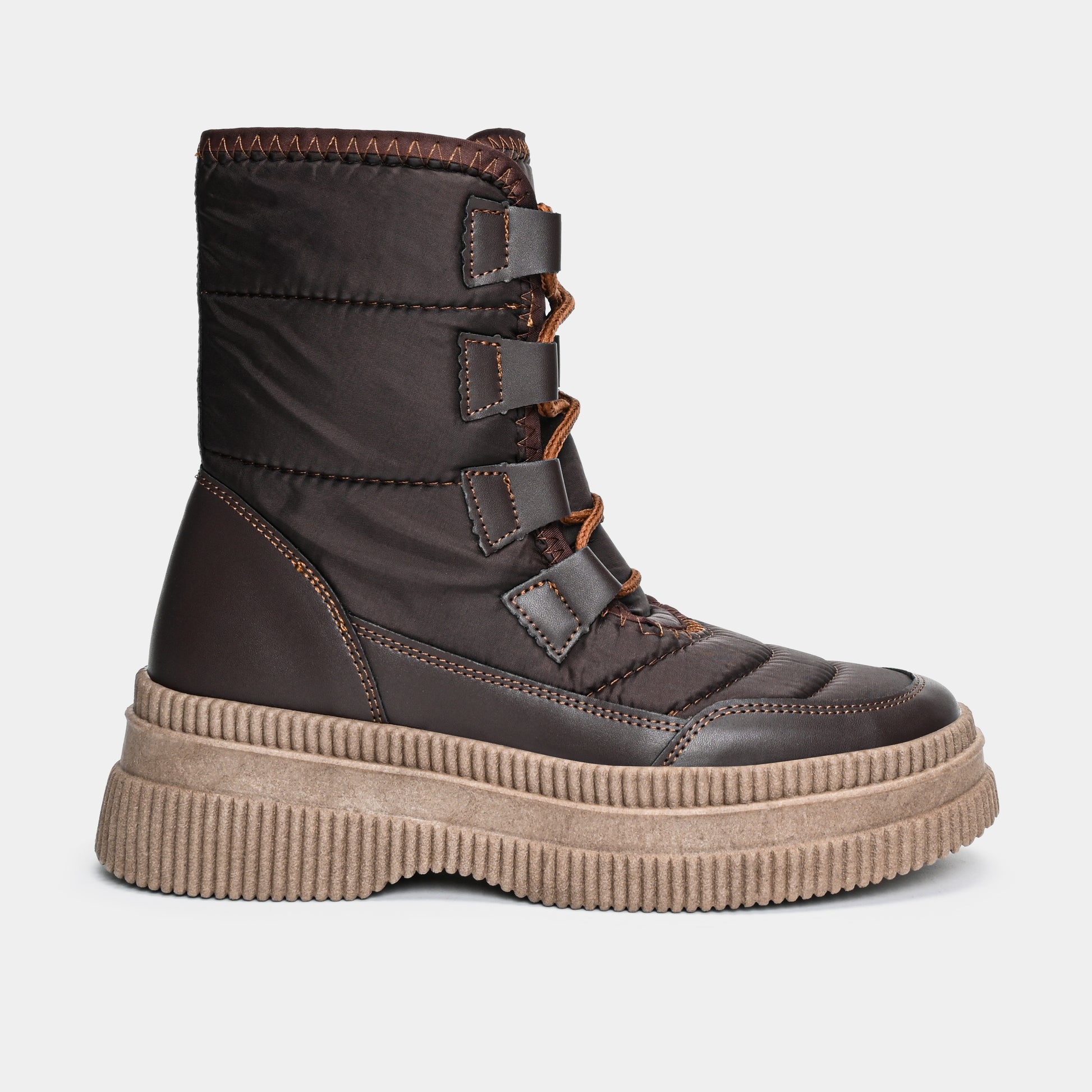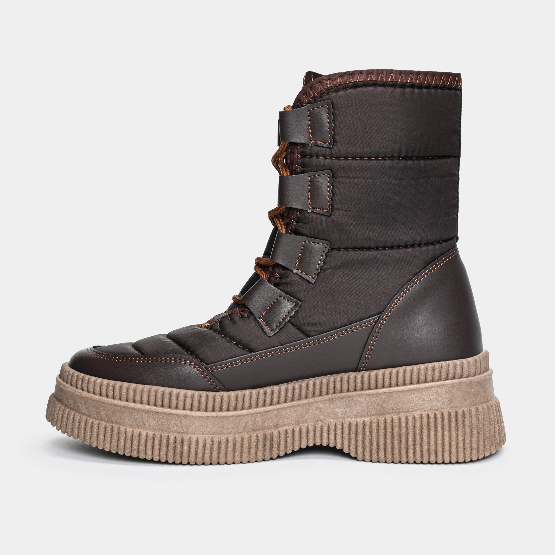Redefine el confort urbano con una silueta que es un manifiesto de estilo y audacia. Esta bota, con su cuerpo acolchado, se siente como un abrazo cálido, una protección contra el ritmo acelerado de la ciudad. El contraste vibrante llega con el sistema de agujetas y las costuras que dibujan una línea de diseño artesanal sobre la textura funcional. Sin embargo, la verdadera declaración de intenciones reside en su imponente suela track de plataforma, una base robusta diseñada para darte altura y una pisada todoterreno con una grinta inigualable. Nacida para la mujer que no sacrifica la comodidad por el diseño, esta pieza es la fusión perfecta entre la vanguardia del street style y la funcionalidad que exige el día a día.